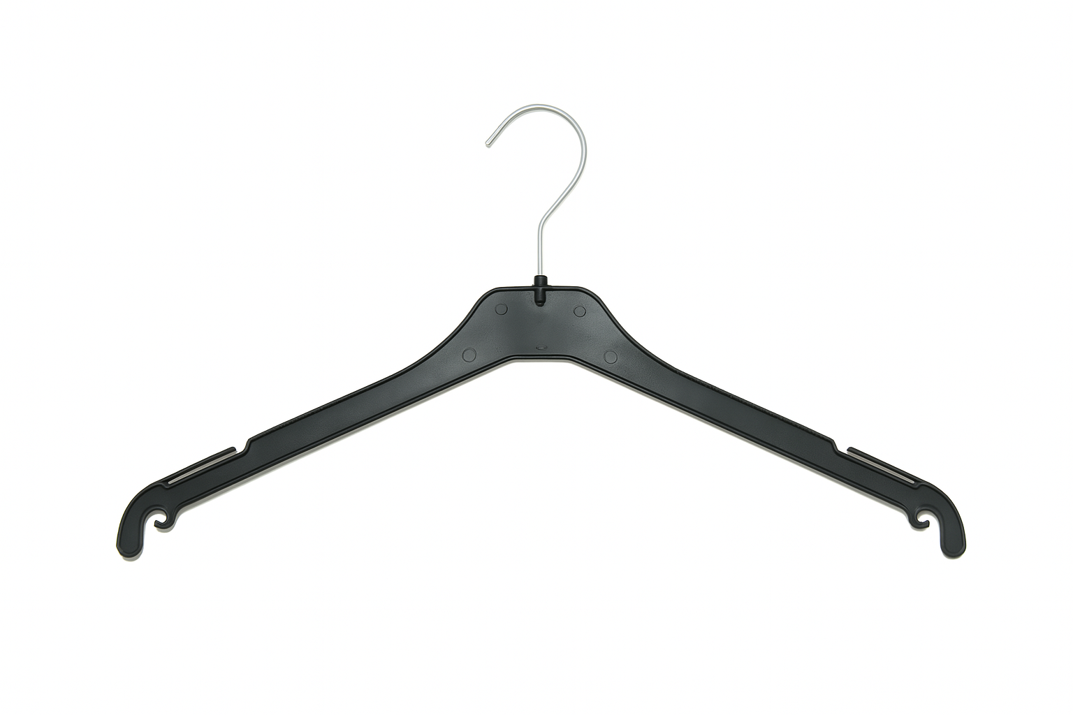 Vlakke blousehanger van zwart kunststof met versterkt profiel. Geschikt voor blouses, overhemden, tops en lichte jassen. Lichtgewicht, ruimtebesparend en ideaal voor gebruik in winkels, wasserettes en thuis.
